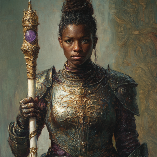 dark skinned female wizard, early 40s, wearing ornate full plate armor, harsh expression, haired tied in a bun, carrying an elaborate staff of carved ivory tipped with a purple crystal, oil paint