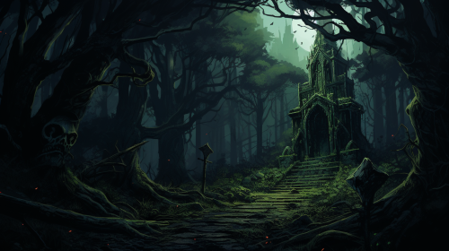 #103733 twilight, forest thicket, impenetrable thickets, medieval trail, in the middle of the trail a giant spider with red eyes and powerful paws, old spreading trees with dense foliage, thickets of grass and bushes, evening fog, summer, realism, high detail, 4k --v 6.0 --ar 1:1