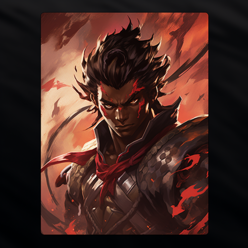 Anime style, jujustu kaisen, Dark skin, Hair tied, Samurai, oni mask, Attack from above, Flaming sword, trading card