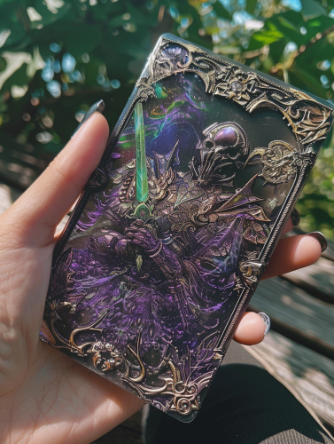 llustration, ink on paper, of a fantasy occult trading card of a retrofuturistic armored knight holding a laser sword. with a backdrop of psychedelic portal in the art style of Graham Ingels, Mike Mignola, centered, psychedelic colors, vintage, --ar 3:4 --v 6.0 --s 75