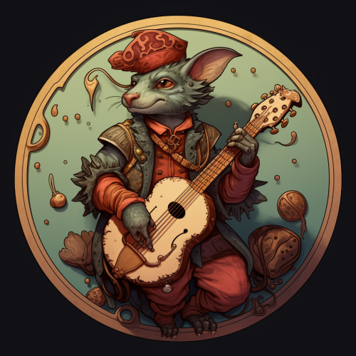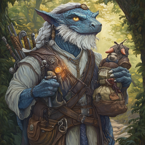 A 2-foot tall Kobold Lore Bard named Rufus, with scaly green skin, glowing amber eyes, and a braided white beard. He has a mysterious brand on his chest and is missing his left pinky finger. He wears worn leather traveling clothes and carries a tinker's tools and a small bag of gold on his belt. dungeons and dragons