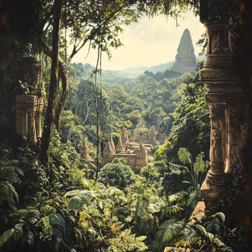 Heavily eroded ruins of an elven kingdom overtaken by forest vegitation. dark fantasy artstyle