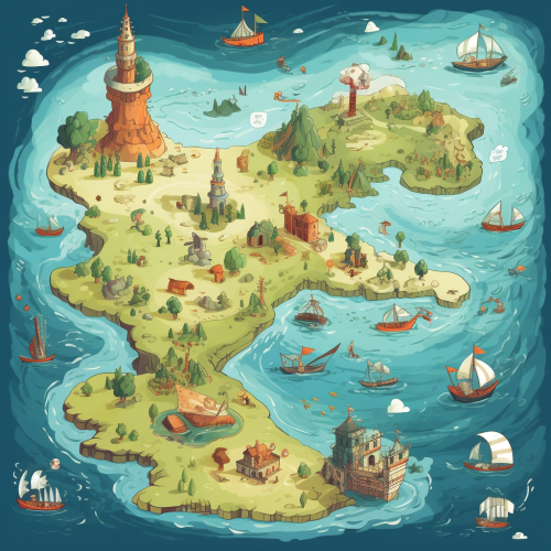 A watercolor map of a fantasy island, featuring lush jungles, active volcanoes, and hidden treasure spots, surrounded by a vast ocean. The map is colorful with flowing brushstrokes and delicate details. Soft pastels, gentle lighting, subtle shadows. Created Using: watercolor paints, fantasy art style, delicate brushes, organic forms, fluid color transitions, hand-painted texture, whimsical labels, natural topography, hd quality, natural look --ar 1:1 --v 6.0