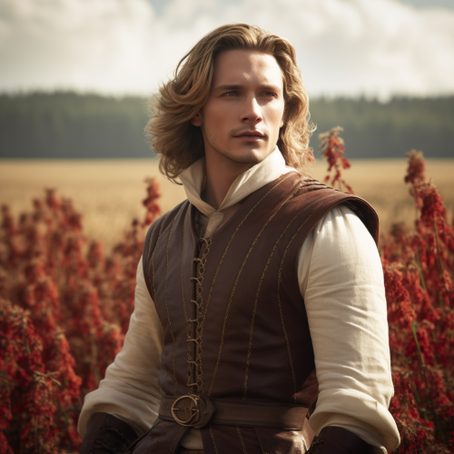 blonde Hair David Oakes as a Targaryen Prince, medieval, 4k, realistic, noble clothes, window with view of wheat fields in background