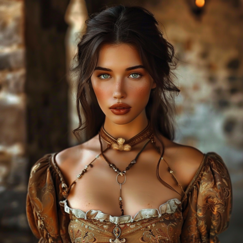 ink drawing of a beautiful medieval woman with long flowing lavender hair. Diaphanous gown. Hands on her hips. Full body view. View point from the back.