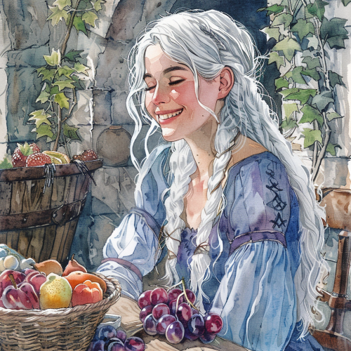 An art nouveau illustration of a radiantly beautiful young woman in her 20s with long, wavy silver-white hair woven into a loose braid. She is smiling peacefully as she snacks upon fruit. Medieval fantasy setting, full body angle