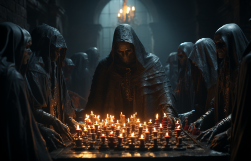 A horror-themed fantasy photo taken in medieval basement in the Warhammer Fantasy world of a group of robed and hooded men attempting a summoning. Room is lit only with candles. They chant and implore. Fantasy setting. Very detailed. Very realistic. On a CANON EOS C500 MARK II, f/22, Shutter Speed 1/ 1000, ISO 1000, 55mm lens, low lighting, cinematic scene, fx, HDR, epic composition, cinematic photo, hyper - realistic, hyper - detailed, cinematic lighting, particle effects, action photography, hyper realistic, 8k resolution, unreal engine, photorealistic masterpiece, smooth, real photography, full hd, Megapixel, Pro Photo RGB, VR, Good, Massive, Half rear Lighting, Backlight, Incandescent, Optical Fiber, Moody Lighting, Studio Lighting, Soft Lighting, Volumetric, Conte - Jour, Beautiful Lighting, Accent Lighting, Screen, Ray Tracing Global Illumination, Optics, Scattering, Glowing, Shadows, Rough, Shimmering, Ray Tracing Reflections, Lumen Reflections, Screen Space Reflections, Diffraction Grading, Chromatic Aberration, GB Displacement, Scan Lines, Ray Traced, Ray Tracing Ambient Occlusion, Anti - Aliasing, FKAA, TXAA, RTX, SSAO, Shaders, OpenGL - Shaders, GLSL, hyperrealistic photography --s 750 --ar 14:9 --v 5.2