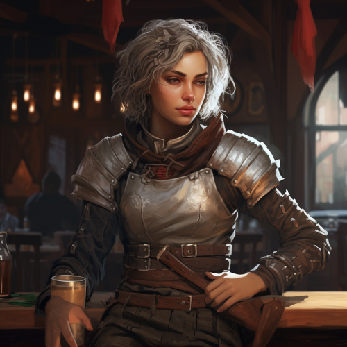 warhammer fantasy, style medieval, a woman, leather armor, short light hair, harsh face, tavern