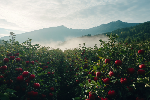High angle shot from a drone, an apple orchard with red apples, a mountain backdrop, fog, morning light, sharp image, very good image details --ar 3:2