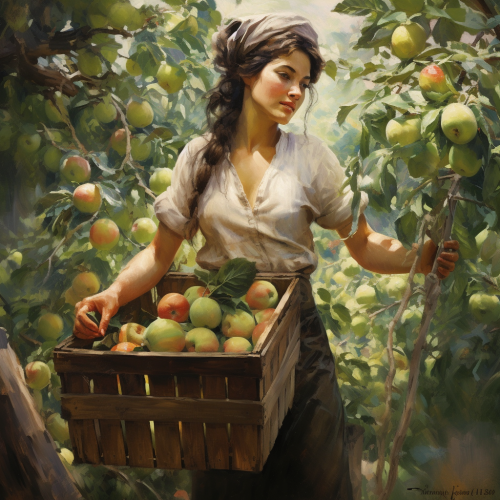 an oil painting of a blonde woman with full red lips standing in an orchard picking apples from the trees and placing them in a basket in the style of Edward Willis Redfield