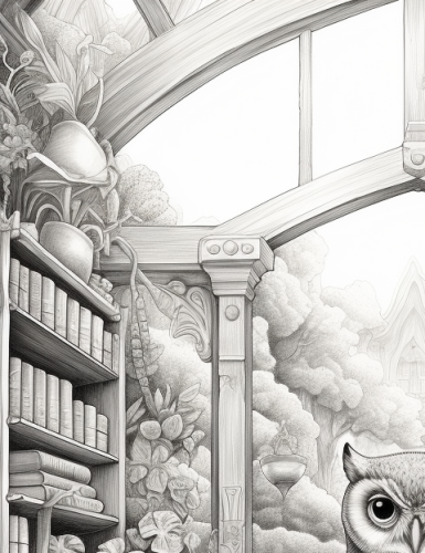 a hyper-realistic pencil sketch, in light gray and white only, of a magical fantasy library with many books on shelves, and a majestic owl, with succulents and potted plants, and glowing crystal balls, intimate interior room, minimal shading, ho, in the style of naoto hattori, detailed illustrations, e. h. shepard, wood, ben wooten, moebius, naturalistic charm --ar 100:129