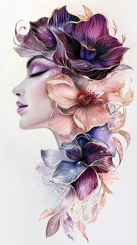 A surreal and highly stylized profile of a woman whose hair is made up of wavy, spiraling flower petals. The flower petals resemble peonies or dahlias, flowing gracefully around her face and body. The color palette features a combination of deep burgundy, pastel pink, and soft lavender for the petals, gradually transitioning into a metallic rose gold towards the ends. Her skin has a pearlescent glow with hints of soft blush and silver highlights, creating an ethereal appearance. Her eyes are large and captivating, with an icy blue and soft lavender gradient. The vines around her are slender, with smooth, abstract curves, and the background is a dreamy mix of sunset tones--peach, lavender, and blush, fading into a soft glow. Perfect for high-resolution digital screens and apparel, with an emphasis on elegance, fluidity, and fantasy. --ar 9:16 --quality 2 --personalize pjscs11 --stylize 200 --v 6.1