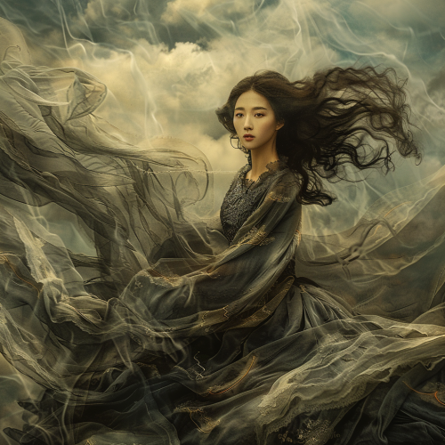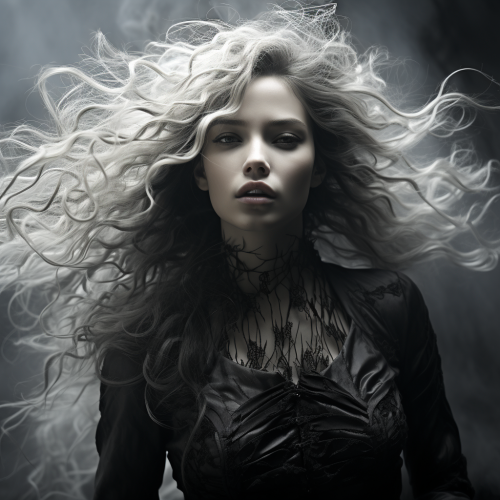 black and white , a woman with long curly white hair, wind blowing in the hair, fog, melancholic mood, surreal and soul, blur, macabre, obscure, fantasy and horror inspiration, unreal engine, hyper realistic, photo realistic, creative, magical, mystical, ethereal, surreal, darkness, silence, dark inspiration, goth style, --s 750
