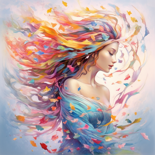 a girl with flowers on her floating hair, wind blows, hair and dress flying, style of soft pastels, colorful, sparkling, abstract, illustration --v 5.1