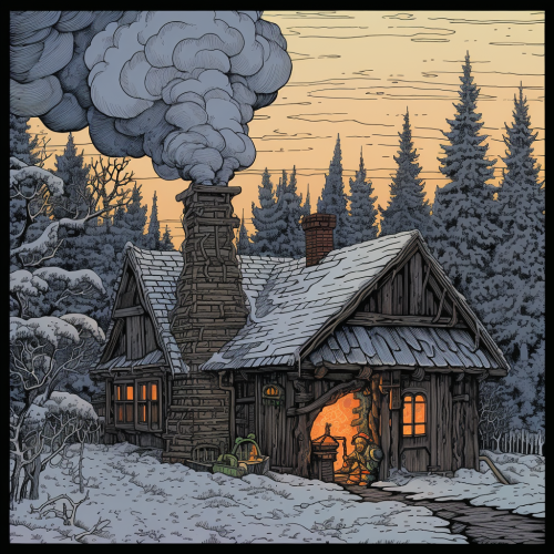 Wizard blows a plume of breath toward the house trying to blow the house down, full color, style of Ivan Bilibin:3, style of R. Crumb --stylize 75