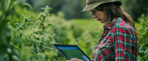 a wide angle photograph of a female farmer on right side of photo using an ipad whose screen shows charts and graphs in mossy greens and rich blues , copy space on left, shallow depth of field, soft focus --ar 12:5 --v 6.0 --style raw