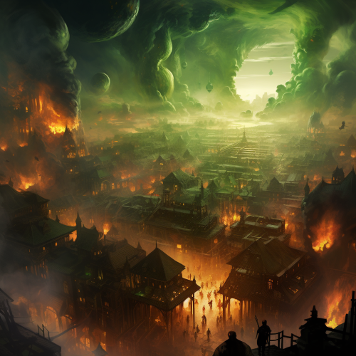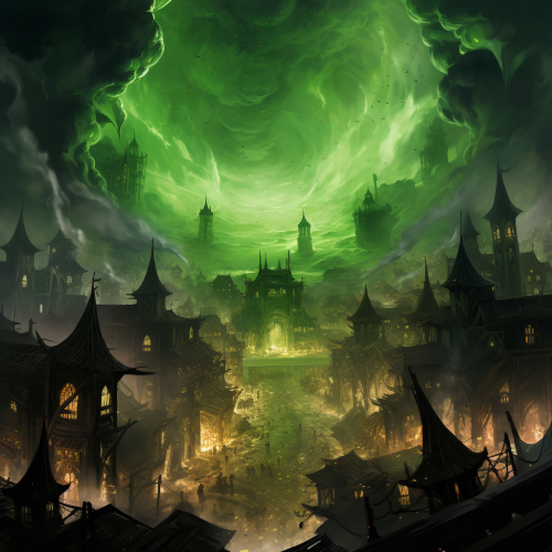 DnD artwork, fantasy town, large town, burning buildings, smoke, fire, four very large pillars at the edges that are gathering souls, green soul slivers, chaos
