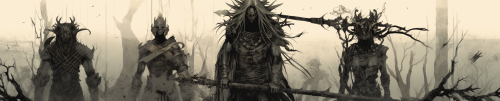 like a manga scene with three characters, a pair of viera final fantasy warriors of light, surround a witchking human warrior with dreadlocks whipping as he spins, action scene, african american, shades and shadows, cedar forest of gloomy majesty and dark terror, a horror of fantasy and enchantment, from both sides, guns and outlaw style manga scene, pencil sketch with dramatic emphasized strokes, lightly shaded with color pencils for emphasis only, --ar 5:1