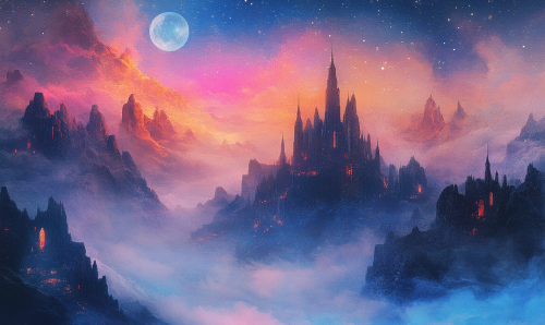 a medieval fantasy scape wih dragons, castles, fog, magical, airbrushed, 1980s, neon colors, background art, night time, stars, pink, orange, baby blue --ar 5:3