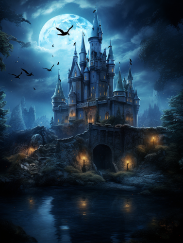**An ancient realistic well lit up castle at night by blue lamps surrounded by trees, ravens flying on top, full moon shining --ar 3:4