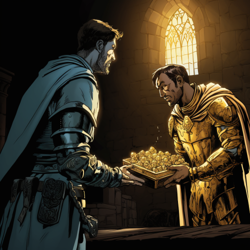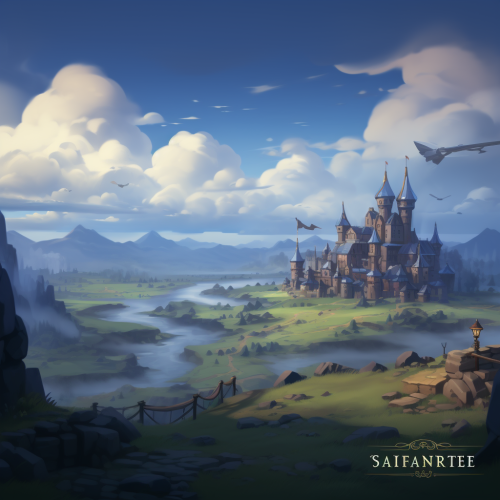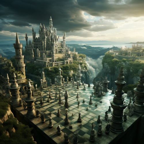 a chess game that physically takes place in the territory between two opposing kingdoms, their castles appear as part of the background scenery, during daylight