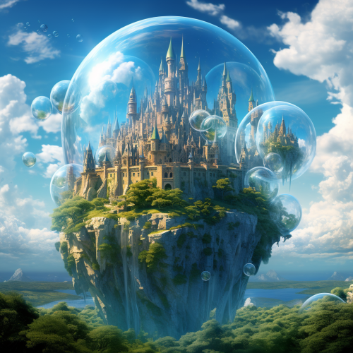 a dragon soaring through sapphire skies. floating castles and mythical landscapes. a floating ocean with deep ancient ruins and playful dolphins jumping over the water. Photography with Sony A9 --v 6.0 --s 50 --style raw
