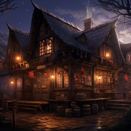 a dungeons and dragons tavern with warm light emitting from the windows, light rain outside, large horn above the front door; far eastern fantasy