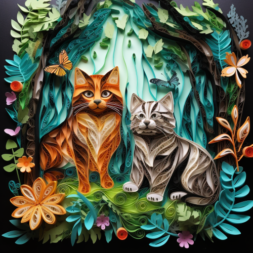 a cat and a dog in the forest, multi-dimensional origami quilling style illustration, paper quilling style