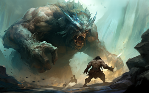 the trolls: a fantasy epic battle against a huge beast stock photo image of, in the style of soft, blended brushstrokes, muted colors, light teal and dark brown, realistic perspective, mimicking ruined materials, isolated figures, flat shading, varied textures --ar 8:5