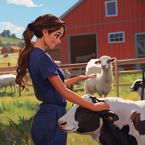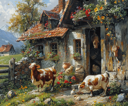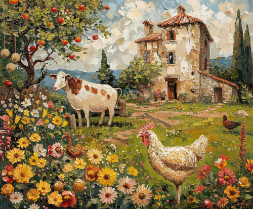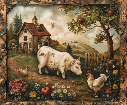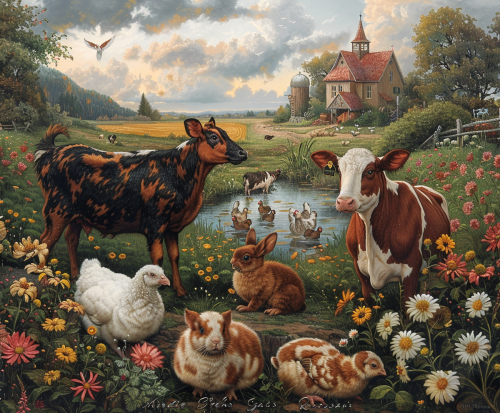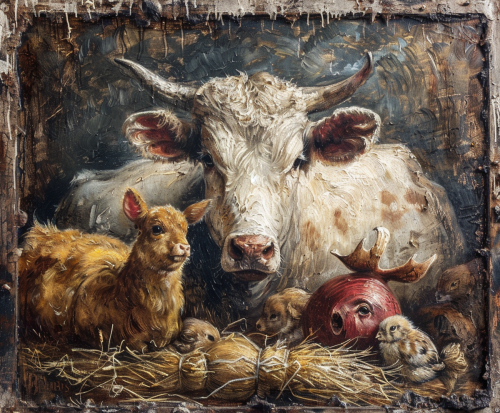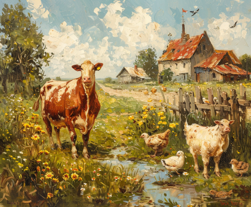 une image qui montre la basse-cour d'une ferme, avec une vache, une cochon, une poule et un coq, des chèvres et des lapins. Dans un style de peinture anïve --ar 6:5 --v 6.0 --s 250
