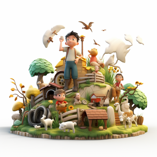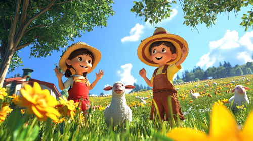 little girl and little boy, 5 years old, farmers, farmyard setting, cow, chicken, sheep, blue sky, tress and grass, cheerful, having fun, pixar style, animation, cartoon, 3d --ar 16:9