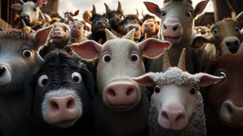 a farm of animals packed together looking out. they are all very cute and adorable with big eyes. there is a pig, a cow, a horse, a goat, a sheep. photo realistic. --ar 16:9