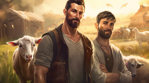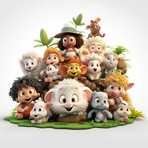 little girl and little boy, 5 years old, holding hands, farmers, farm animals, cow, chicken, sheep, blue sky, landscape, pixar style, animation, cartoon, 3d, having fun