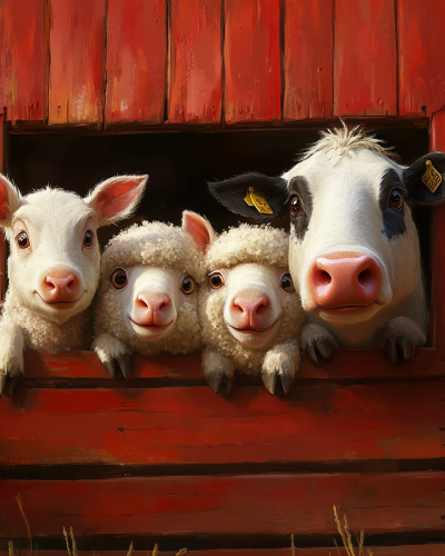 cute and adorable and happy a pig, a cow, a horse, a sheep, cute, adorable, with big eyes. they are packed together looking out. a red barn is behind them. photo realistic. --ar 4:5 --v 6.1