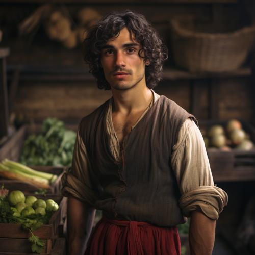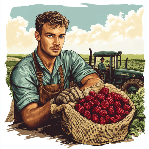 Design a logo featuring a muscular, 24-year-old farmer, with short brown hair and blue eyes, working on a vintage-style tractor. The farmer has a sun-kissed complexion, typical of a hardworking kibbutznik, and is dressed in casual work clothes. Next to the tractor, place a burlap sack overflowing with plump, fresh raspberries. The background should feature vast, lush green fields under a sunny sky, symbolizing the farmer’s connection to the land. The overall style should be strong yet inviting, representing the simplicity and hard work of kibbutz life.