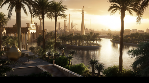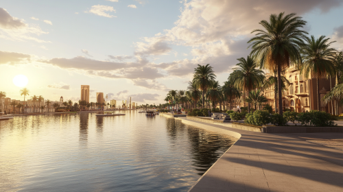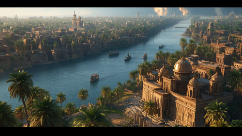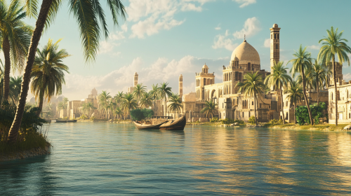 a ultra photorealistic futuristic approach to imagine the best city in the world that is located on the most beautiful river, Al Basra in Iraq, is one of the oldest cities in the world and the most rich in Palm trees, Authentic buildings and Monuments, grenery, each area is seamlessly connected to one another, cinematic lighting, medium contrast. --ar 16:9 --style raw --v 6.1 --fast --s 50