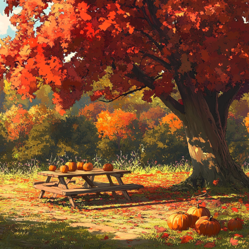 an animation drawn in the style of studio Ghibli of a peaceful autumn scene in an orchard featuring a large tree with vivid red and orange foliage a wooden picnic table covered with fallen leaves and pumpkins scattered across the ground. Rose of apple trees are visible in the background, creating a calm, serene atmosphere that and bodies the beauty of the fall harvest season.