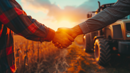 emotional handshake between a farmer and a truckdriver, a tractor and a semi truck in the background, editorial shot, golden hour, cinematic lighting, dutch angle shot, vibrant colors --ar 16:9 --style raw --v 6.0