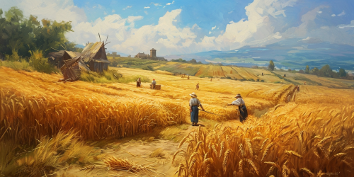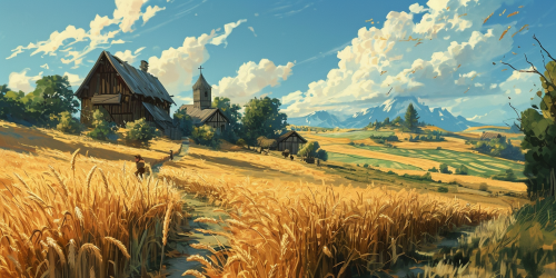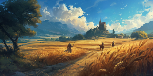 Create an image that captures a vast, sprawling farmland in a medieval setting, with the primary focus on a landscape of lush wheat fields. The wheat should be golden and ripe, swaying gently in the breeze, extending into the horizon. In the background, include a few farmers tending to the fields, subtly integrated into the scenery to maintain the focus on the landscape. The style should be reminiscent of Randy Vargas, known for his vivid and dynamic compositions. Highlight the natural beauty and textures of the wheat fields, emphasizing the rustic charm of the medieval era. The overall scene should convey a sense of tranquil, pastoral life in medieval times, with a color palette that brings out the golden hues of the wheat and the essence of a bygone era. --v 6.0