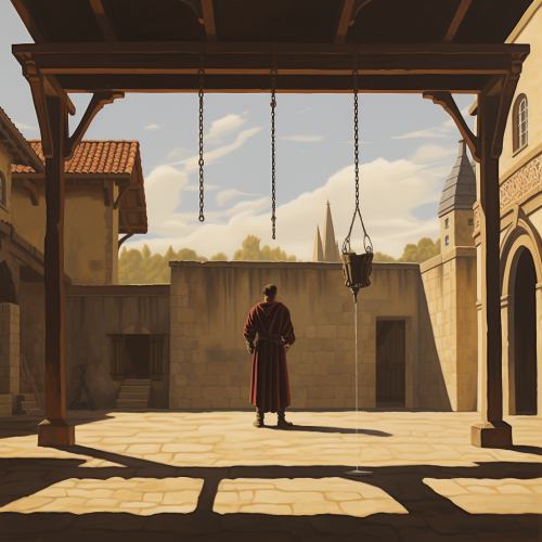 A man stands in the sun in the middle of a large square, with his shadow visible behind him, The shadow hanging from the gallows , middle ages --v 5.2