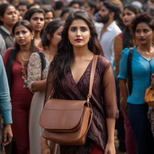 Real indian modern Women photoshoot is with her handbag standing in the crowd