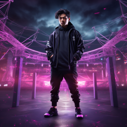 Japanese male of normal build in his 20s wearing sportswear. He has short black hair and is 173 cm tall. His outfit is a sporty-looking jacket and pants style, using shades of purple and pink. The background is a futuristic nighttime soccer field.full body shot.photograph.