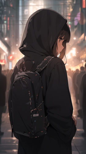 japanese girl with back turned to the camera, wearing a black oversized hoodie in downtown tokyo, not wearing a backpack, nothing else on her back, anime style of makoto shinkai --niji 5 --ar 9:16