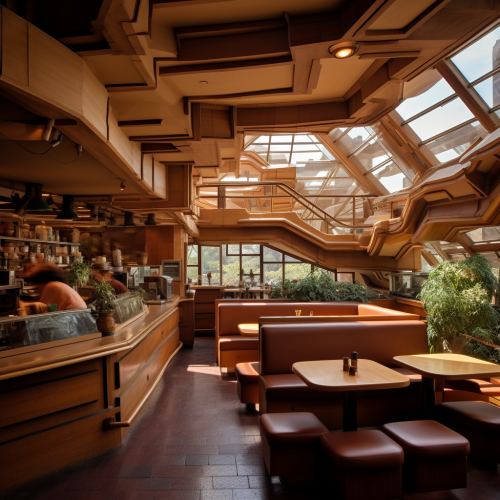 a small shopping island with a Starbucks style that sells crepes using farmhouse and navy blue as the brand colors located inside a bus station, with high quality cinematographic style photography in 4k with a canon camera with an iso 100 , f/10, --ar 16:9