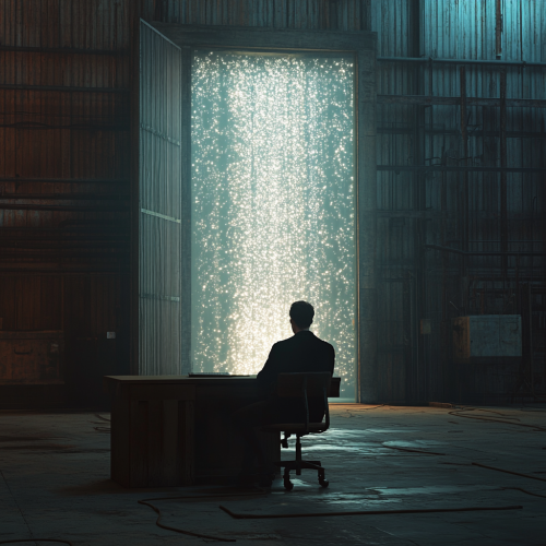 peeking through the doors of a massive warehouse, a young stylish man sits off to the side at an old desk with his back to the camera, watching a light show that asymmetrically is displayed on the wall in front of him, hyperrealistic