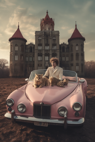 a man with gold hair stands in a convertible car, there are two large cats in flanking the car one white and one black, pale pink colors, soft colors, castle in distance, crown, low light, soft light, photoshoot by rae caesar + wes anderson + vee speers, surreal fashion, Post-processing, Post-production, cell shading, tone mapping, CGI, VFX, SFX, hyper-realistic, elegant, hyper-realistic, over-detailed, hyper-realistic, volumetric, photorealistic, ultra-photorealistic, over-detailed, super detailed, full-color, volumetric lighting, high contrast, HDR super detailed, grain filter, Clear focus, --ar 2:3 --s 750 --v 5.0