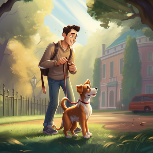 a man walking his dog in a park in daylight. He stops to tie his shoelace and puts the dog's leash in the man's mouth. The Dog pulls on the leash, straining while watching a cat. The man is looking away from the dog. pixar style cartoon