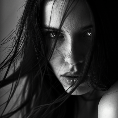 A beautiful woman with dark hair, photography black and white, --v 6.0 --s 50 --style raw
