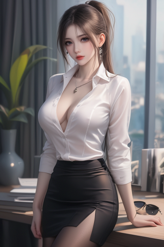 A female model as secretary, wear white Long sleeve shirt and black skirt, ponytail hair, brown hair, hot weather, Unbutton shirt all button::1.5 , Office desk background, Portrait photo, rim light, ultra-detailed, 3D art, style --ar 2:3 --style raw --stylize 250 --niji 6