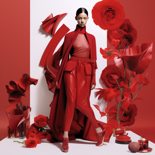 unique fashion mood board, representing the filling of younghood and playfulness, gratitude and red colour, with an H&M manquen, add 33 related things in diferent colour and style and mood to represent our main mood.